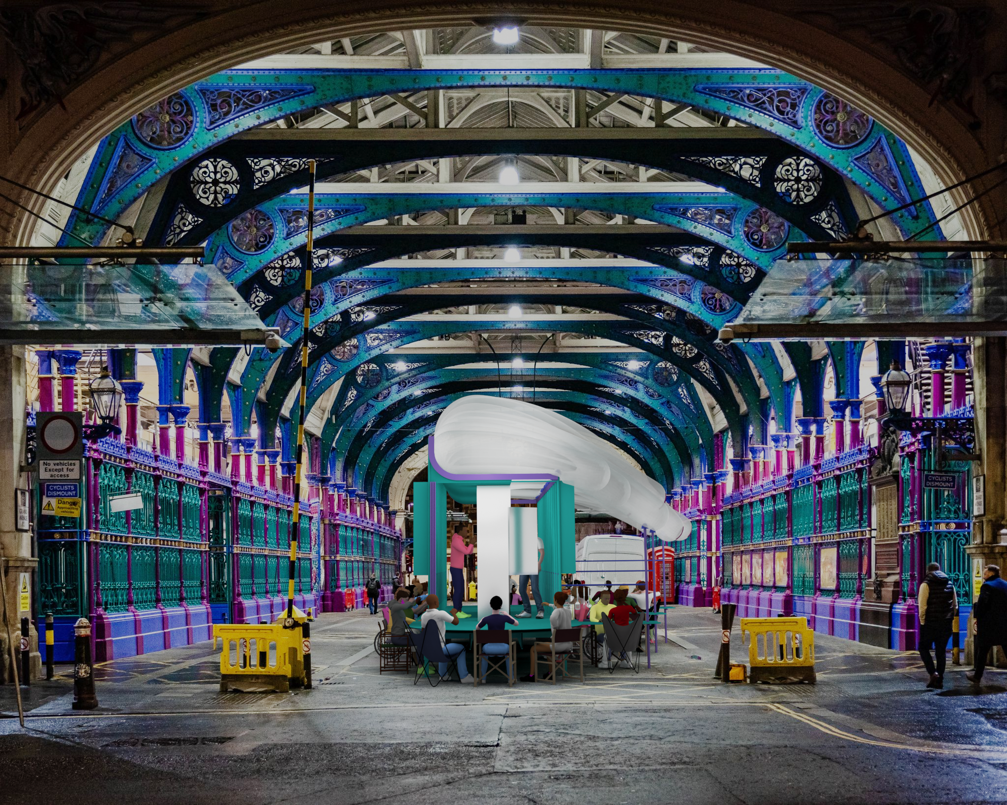 For this competition, we wanted to examine city markets (From Queen’s market in Newham, Woodgrange Market in Forest Gate, Ridley Road Market in Dalston to what remains of Smithfield in proximity to Farringdon Station and many others) as a site and use food as the medium to create happenings to collect and narrate common experiences of vendors and local residents into social and artistic forms of gathering. Through unconventional gastronomic assemblages, we will initiate participatory practices and independent micro-economies. We envision operating devices both in Smithfields and the relocated sites in East London, to look into the past, present and future of city markets to seek our future adaptation.
